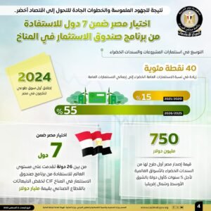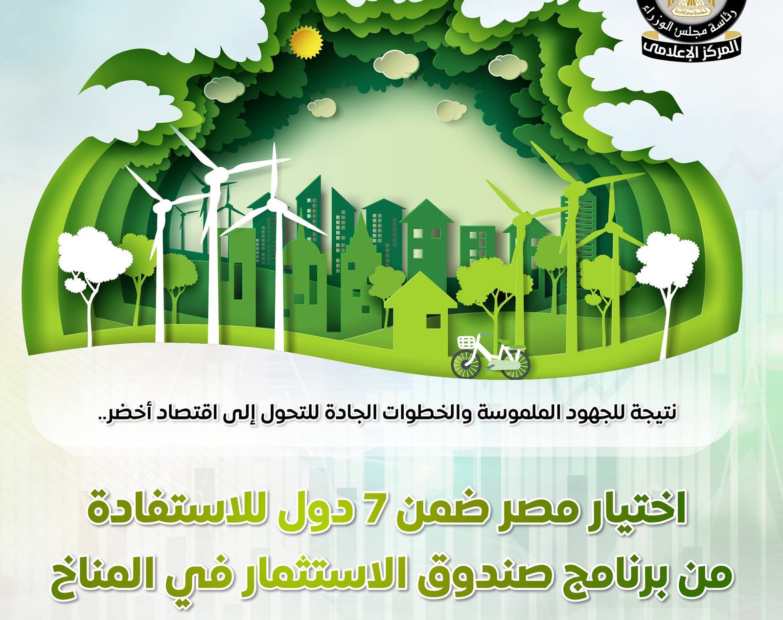 نشر المركز الإعلامي لمجلس الوزراء عددًا من الإنفوجرافات عبر منصاته على مواقع التواصل الاجتماعي، سلط من خلالها الضوء على اختيار مصر ضمن 7 دول للاستفادة من برنامج صندوق الاستثمار في المناخ “CIF”، وذلك نتيجة للجهود الملموسة والخطوات الجادة التي تنفذها الدولة في إطار التحول نحو الاقتصاد الأخضر.