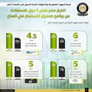 يأتي ذلك في ضوء توجه الدولة نحو تعزيز الاقتصاد الأخضر، والتوسع في استخدام الطاقة النظيفة، وتنفيذ مشروعات تنموية صديقة للبيئة، بما يعكس التزام مصر بالمعايير العالمية للتنمية المستدامة، ويعزز من فرصها في الحصول على التمويلات الدولية المخصصة للعمل المناخي.