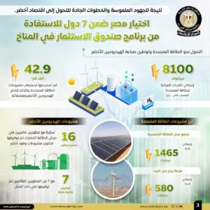 وفيما يخص التحول نحو الطاقة المتجددة وتوطين صناعة الهيدروجين الأخضر، أوضحت الإنفوجرافات، أن إجمالي القدرات المركبة للطاقة المتجددة “شمسي – مائي – رياح” بلغت 8100 ميجاوات، وتم تخصيص 42.9 ألف كم2، لاستيعاب مشروعات الطاقة المتجددة، وكذلك لإنتاج الهيدروجين الأخضر ومشتقاته.