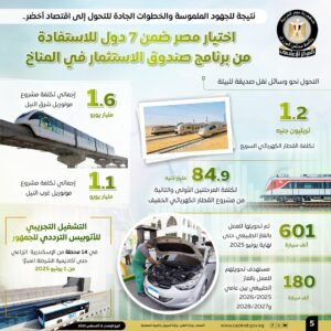أما على صعيد التحول نحو وسائل نقل صديقة للبيئة، فقد بلغت تكلفة القطار الكهربائي السريع 1.2 تريليون جنيه، فيما بلغت تكلفة المرحلتين الأولى والثانية من مشروع القطار الكهربائي الخفيف 84.9 مليار جنيه، كما بلغ إجمالي تكلفة مشروع مونوريل شرق النيل 1.6 مليار يورو، ومونوريل غرب النيل 1.1 مليار يورو.