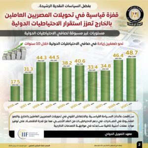 وقد انعكس هذا الارتفاع القياسي في تحويلات المصريين بالخارج على صافي الاحتياطيات الدولية، والذي حقق مستويات غير مسبوقة، ليرتفع لنحو ضعفين خلال 10 سنوات، مسجلًا 48.7 مليار دولار خلال شهر يونيو 2025، ثم واصل الصعود ليسجل 49.3 مليار دولار في أغسطس من نفس العام، بعدما كان قد سجل 17.5 مليار دولار في يونيو 2016.
