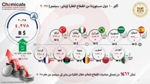 أعلن المجلس التصديرى للصناعات الكيماوية والأسمدة عن تحقيق القطاع نموًا إيجابيًا بنسبة 10% خلال الفترة من يناير إلى سبتمبر 2025، حيث بلغت قيمة الصادرات 6.849 مليار دولار مقارنة بـ 6.208 مليار دولار خلال نفس الفترة من عام 2024، وذلك وفقًا لبيانات الهيئة العامة للرقابة على الصادرات والواردات.