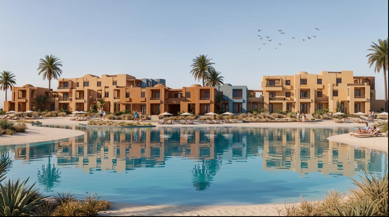 ويعكس تصميم المشروع مزيج مدروس بين الرؤية العالمية والتراث المحلي، مستوحاه من التقاليد المعمارية النوبية من خلال استخدام القباب، والمنحنيات الناعمة، والألوان الرملية الدافئة التي تتناغم بانسجام مع الطبيعة الصحراوية والساحلية للجونة.