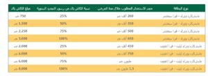 – لا يوجد حد أقصى لعدد أو قيمة معاملات المشتريات، ولكن يتم احتساب قيمة الكاش باك (نسبة من رسوم التجديد السنوية) والوصول إلى الحد الأدنى المطلوب لإجمالي قيمة المشتريات للبطاقة الواحدة خلال مدة العرض وذلك وفقًا للجدول التالي: